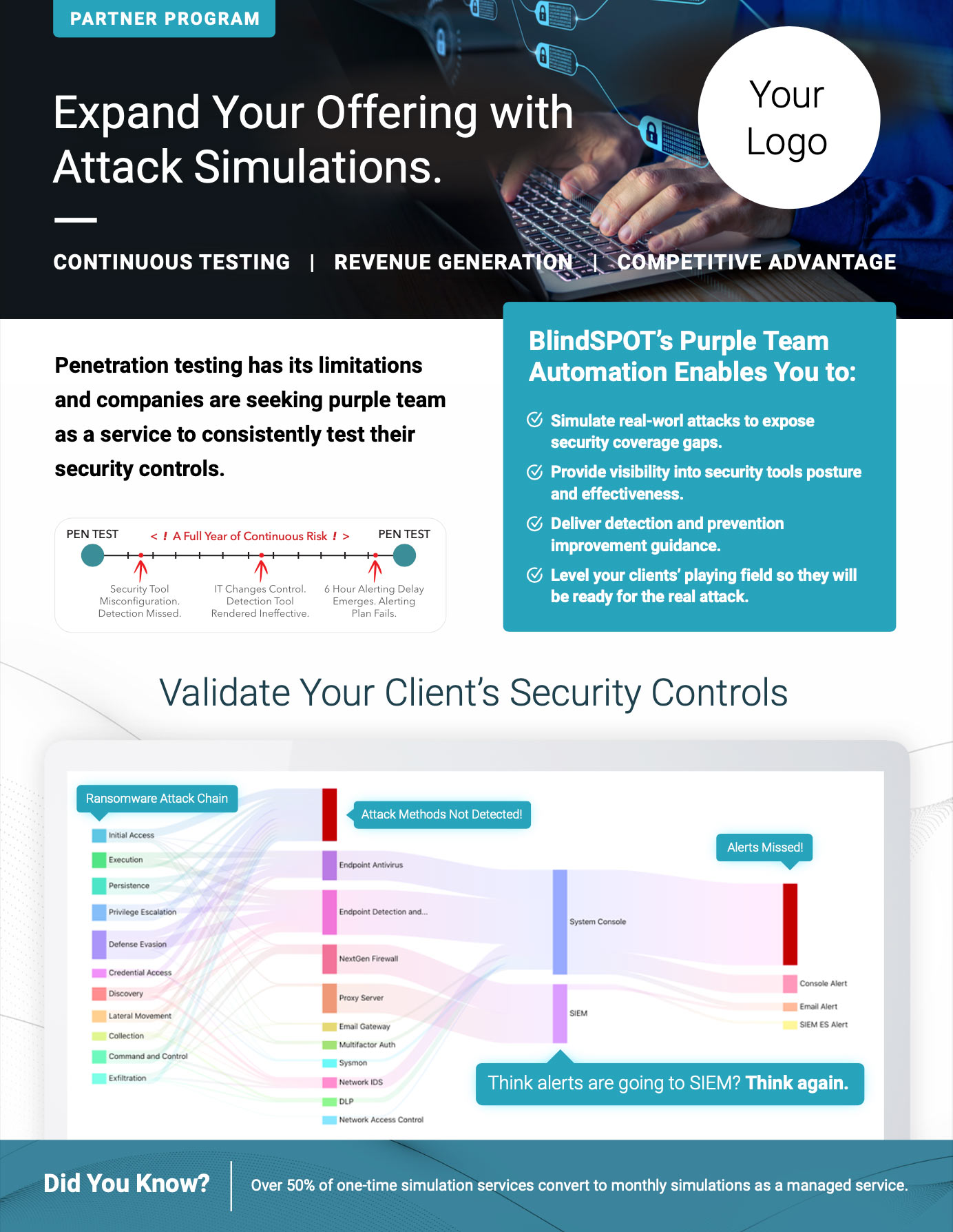 BlindSPOT simulation services show the need to continuously test security controls. This is why over 50% of BlindSPOT one-time simulation engagements convert into monthly simulations as a service.